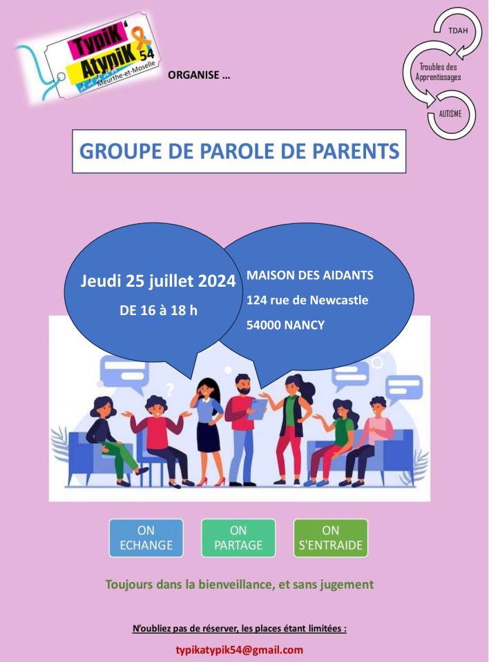 Groupe de paroles de parents à la maison des aidants de Nancy le jeudi 25 juillet 2924 de 16h à 18h : "on échange, on partage, on s'entraide, toujours dans la bienveillance et sans jugement"